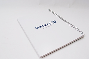 ゲスタンプ・エドシャ・ジャパン株式会社 様オリジナルノート 「本文穴あけ加工」に「本文ミシン加工」を追加すれば、切り取ってファイリングできる便利なオリジナルノートに。 ゲスタンプ・エドシャ・ジャパン株式会社 様オリジナルノート 「裏表紙印刷」でリング製本の裏表紙にもデザイン ゲスタンプ・エドシャ・ジャパン株式会社 様オリジナルノート 特厚フィルムに「表紙箔押し加工」を追加して、高級感のある仕上がりに
