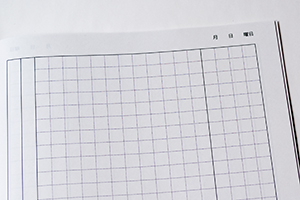 株式会社四輝 様オリジナルノート 「本文オリジナル印刷」で専用フォーマットに、独特の罫線使いが特徴 株式会社四輝 様オリジナルノート 「本文オリジナル印刷」のクローズアップ 株式会社四輝 様オリジナルノート 中綴じ製本のオリジナルノートは裏表紙もデザイン